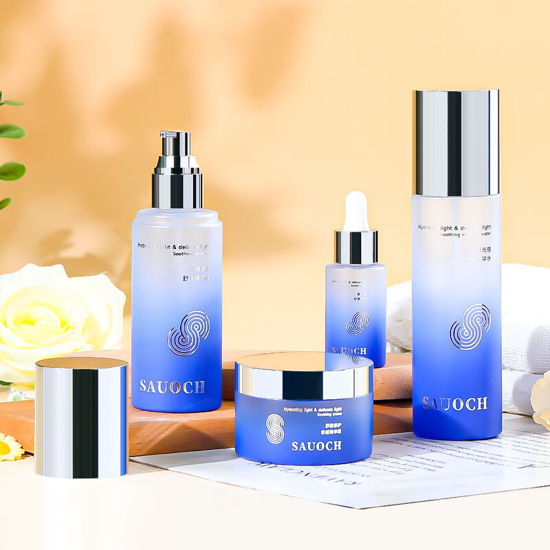 Con un elegante acabado esmerilado degradado azul y tapas plateadas electrochapadas, este conjunto de embalaje para el cuidado de la piel ofrece una apariencia premium que realza el atractivo visual de los productos para el cuidado de la piel.